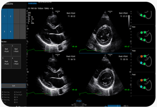Balíček StressEcho obsahuje skórování pohybu stěn a vytvoření zprávy. Obsahuje cvičební StressEcho, farmakologické StressEcho, diastolické StressEcho a volně programovatelné StressEcho.