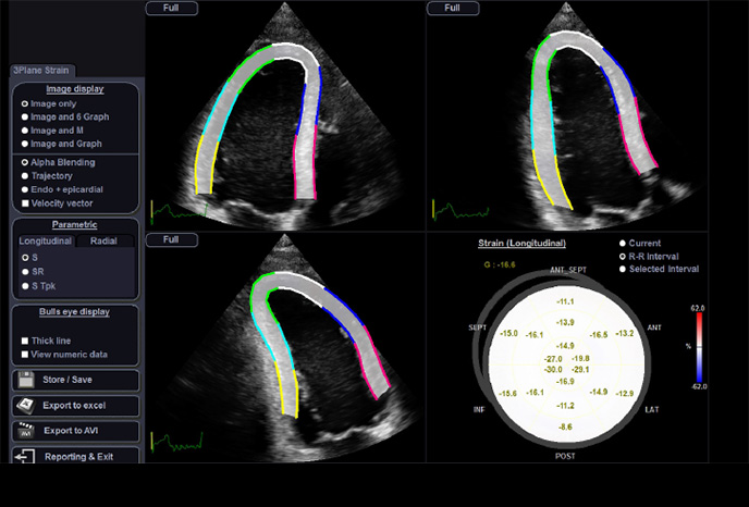 Strain + je kvantitativní nástroj pro měření celkového a segmentového pohybu stěny levé komory (LV). Ve Strain + se na obrazovce zobrazují tři standardní pohledy levé komory a Bull's Eye pro snadné a rychlé vyhodnocení funkce LV.